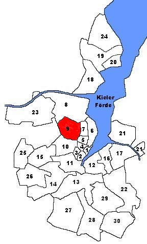1 Altstadt | 2 Vorstadt | 3 Exerzierplatz | 4 Damperhof | 5 Brunswik | 6 Düsternbrook | 7 Blücherplatz | 8 Wik inklusive Projensdorf | 9 Ravensberg inklusive Brauereiviertel, Marineviertel und Stinkviertel | 10 Schreventeich inklusive Französisches, Dichter- und Philosophenviertel | 11 Südfriedhof inklusive Reformatorenviertel | 12 Gaarden-Ost inklusive Kai-City und Kruppsche Kolonie | 13 Gaarden-Süd und Kronsburg inklusive Grünes Herz und Holsteiner Quartier | 14 Hassee inklusive Hammer | 15 Hasseldieksdamm | 16 Ellerbek | 17 Wellingdorf | 18 Holtenau | 19 Pries inklusive Komponistenviertel | 20 Friedrichsort | 21 Neumühlen-Dietrichsdorf inklusive Afrika-Viertel und Siedlung Oppendorf | 22 Elmschenhagen inklusive Kroog und Krooger Kamp | 23 Suchsdorf inklusive Klausbrook und An der Au | 24 Schilksee | 25 Mettenhof | 26 Russee inklusive Berliner Viertel | 27 Meimersdorf | 28 Moorsee | 29 Wellsee | 30 Rönne