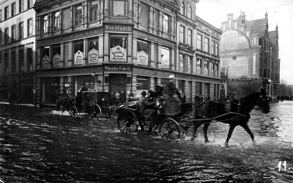 Die Ecke Holstenstraße/Holstenbrücke mit dem Kaufhaus Meislahn beim Silvester-Hochwasser 1904 | Die Ecke [[Holstenstraße]]/[[Holstenbrücke]] mit dem Kaufhaus [[Meislahn]] beim Silvester-Hochwasser [[1904]]. | ||