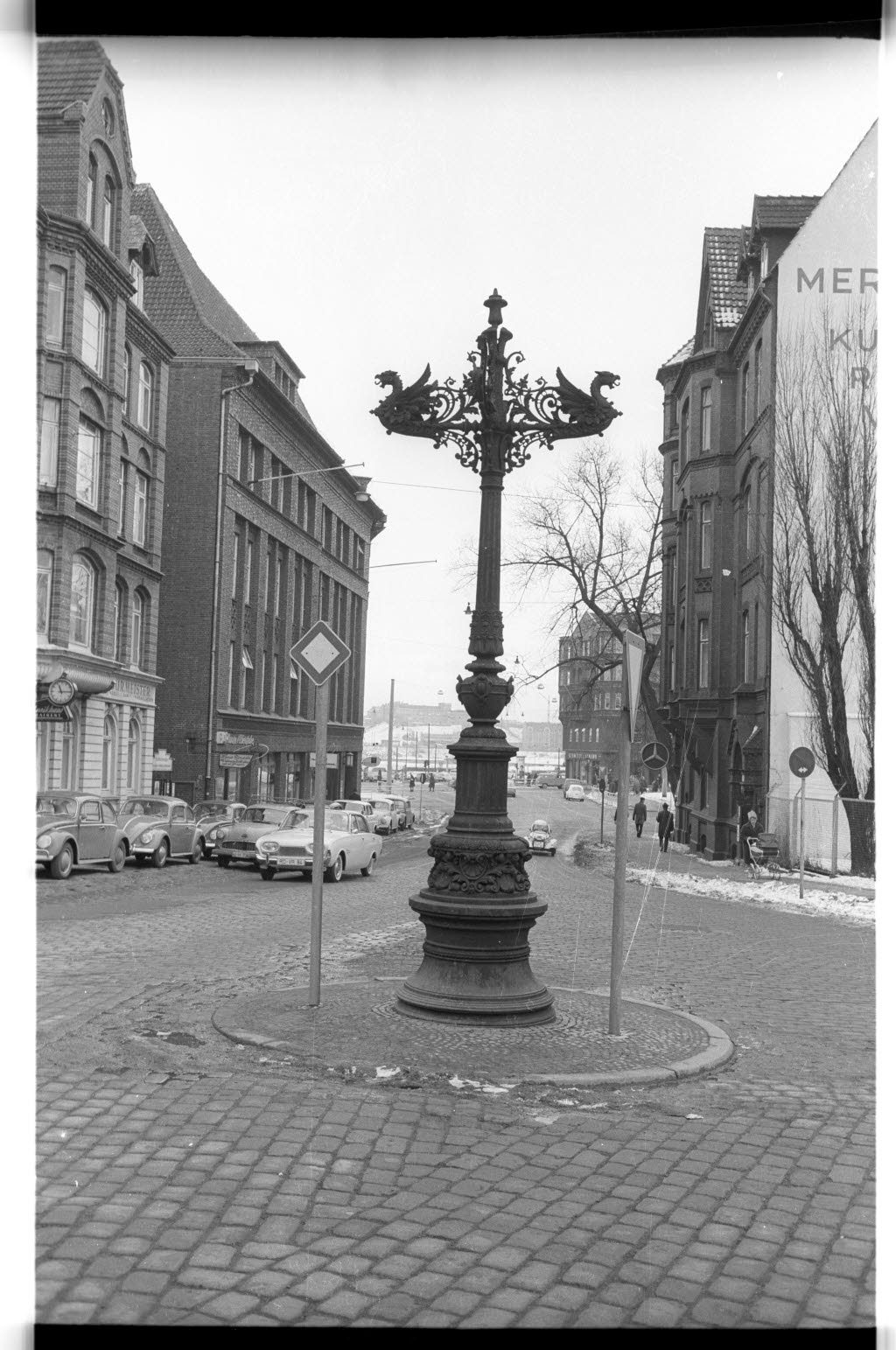 Der seit 1973 auf dem Klosterplatz stehende Kandelaber 1965 an seinem ursprünglichen Standort Ziegelteich, Ecke Lange Reihe/Walkerdamm.